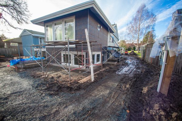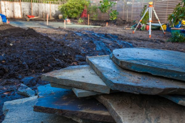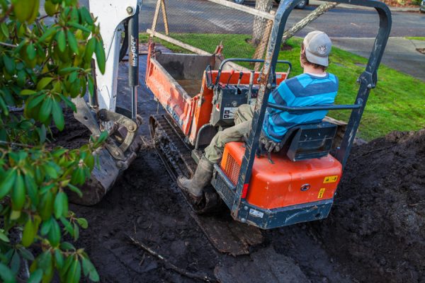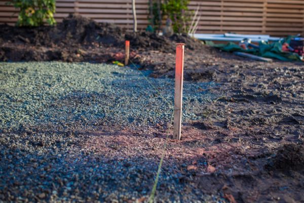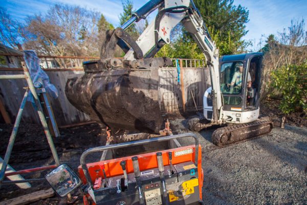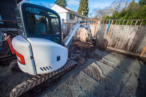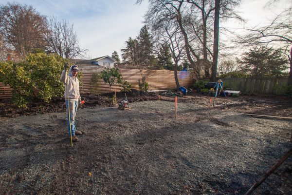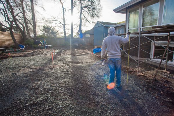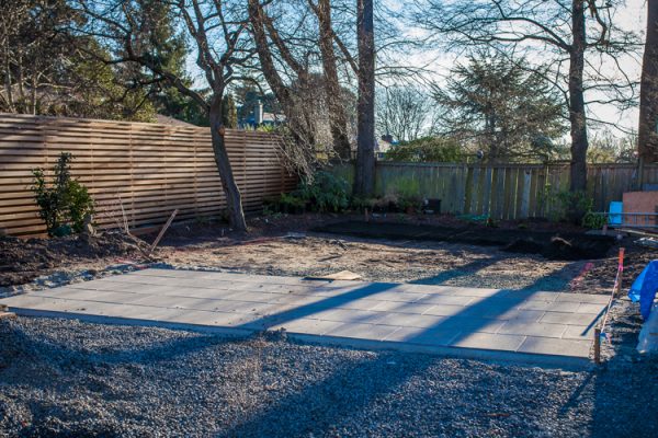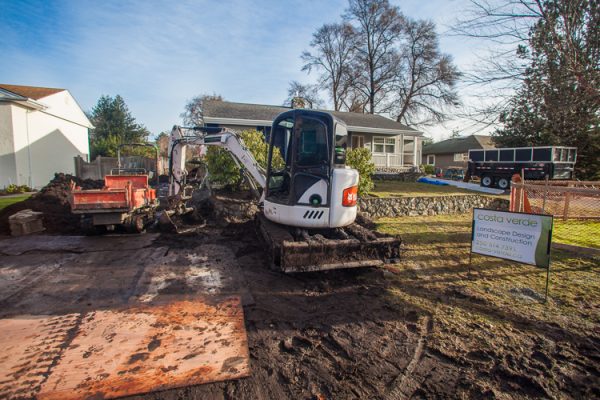 The first step began with transplanting all of the existing plants that they wanted to keep into newly created and freshly cultivated garden beds. Then the landscaping excavated the rest of the outdoor space to start with a clean slate. We brought in road base and compacted it in the required areas, including the deck, patio, and new stairs.