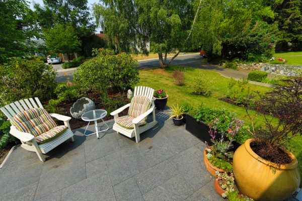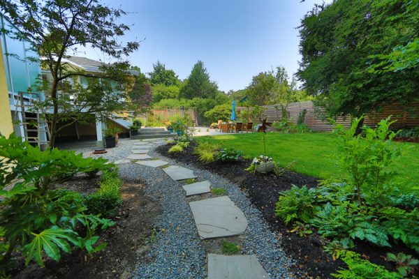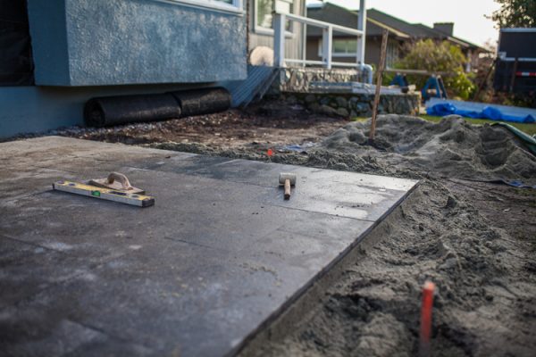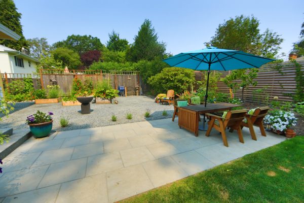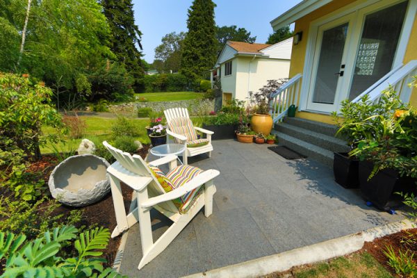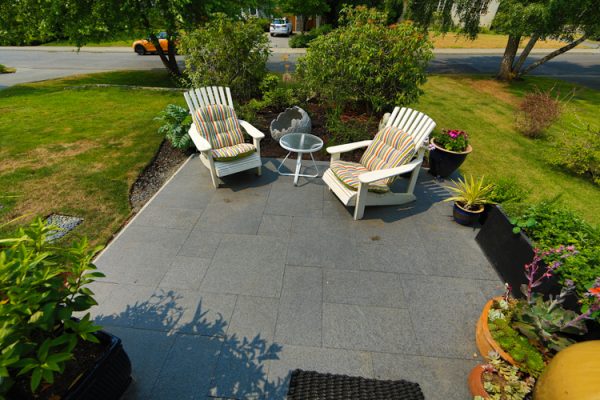 We created a custom patio using cut stone basalt pavers in the front and Abbotsford Texada local pavers in the back patio. Our team hand-picked pieces of slate and added a custom pathway and patio for entertaining.